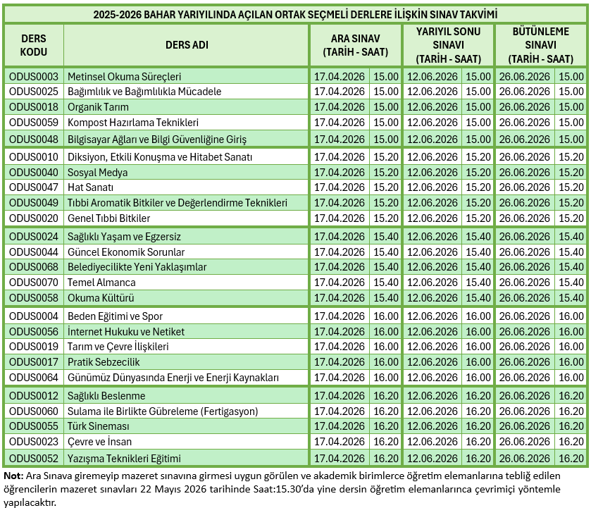 NOT 1 : Yukarıdaki Sınav takviminde de yer aldığı üzere Ortak seçmeli derslerin (Ortak seçmeli havuzunda yer alan ODU kodlu dersler) sınavları dersin öğretim elemanı tarafından belirlenen bir cuma günü saat 15:00-17:00 arasında online olarak yapılacaktır.